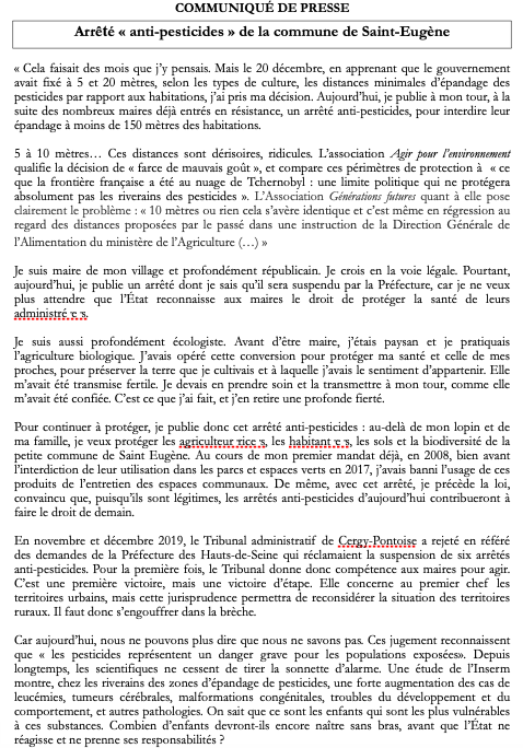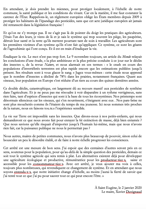 Xavier Duvignaud est maire de Saint-Eugène, en Saône-et-Loire. « J’ai fait le choix d’entrer en désobéissance civile, en publiant le 3 janvier 2020 un arrêté anti-pesticides, pour dénoncer la carence de l’Etat et protéger mes concitoyens, comme la biodiversité de notre village », nous écrit-il. Ses motivations, il les détaille dans un document qui pourra inspirer bon nombre d’élus.