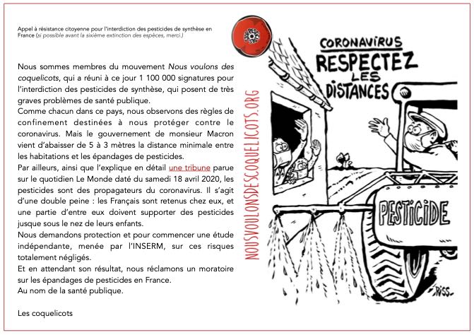 Ecrivons, alertons, sonnons à toutes les portes pour réveiller ceux qui autorisent ces épandages toxiques. Nous vous proposons 2 jeux de cartes postales – le premier numérique, le second à imprimer et envoyer par La Poste – pour sonner les cloches de… tout le monde! Elus de tous bords (députés, sénateurs), préfets, agence régionale de santé (ici)… personne ne doit échapper à notre alerte.