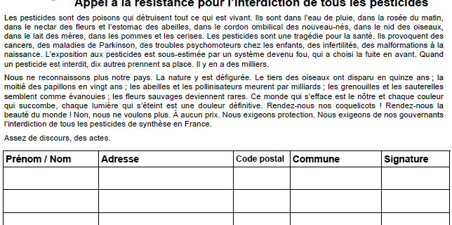 Accueil • Actualités • Page 16Actualités 28-12-18 5 millions de signatures… et après? Amis des coquelicots, vous êtes nombreux à vous demander ce que nous ferions de cinq millions de signatures. Car, rappelons-le,... 20-12-18 A notre glorieux ministre, avec nos compliments Didier Guillaume, ministre de l’Agriculture, n’épinglera pas à sa boutonnière notre cher Coquelicot, car a-t-il dit sur France Culture ce... 18-12-18 Des coquelicots par dizaines de millions Que celui qui n’aime pas les fleurs sauvages lève le doigt. S’il l’ose. Parmi nos grands projets pour 2019 –... 17-12-18 Arpenteurs des villages et des quartiers, c’est à vous On n’y arrivera pas. Mais on y arrivera, bien sûr, car désormais, nous comptons plus sur les signatures papier que... 15-12-18 CE 7 DÉCEMBRE, J’Y ETAIS, J’EN ETAIS! Amis des coquelicots, nous ne vous remercierons jamais assez. Notre rassemblement du 7 décembre, même s’il a été éclipsé par... 06-12-18 Viens avec moi, mon vieux pays Les amis, c’est déjà le troisième rendez-vous des Coquelicots, et ce sera un grand cru, malgré le lourd climat qui... 03-12-18 Coquelicots et Gilets Jaunes, tous pesticidés Certains amis des coquelicots s’inquiètent, et nous les comprenons, évidemment. Les violences urbaines ont traumatisé une partie de l’opinion, mais... 30-11-18 Fiers de vous tous réunis Nous sommes le 30 novembre 2018, vers 21 heures, et notre carte magique compte déjà 539 rassemblements pour le 7... «<...1415161718...>»